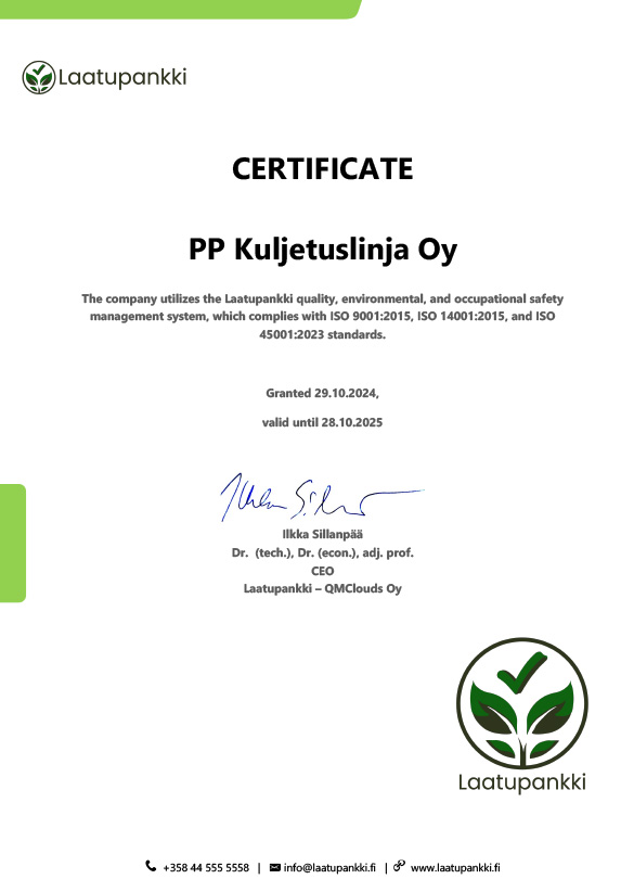 We use the Laatupankki platform to manage and maintain all quality documentation, helping us meet our commitments transparently and efficiently.